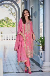 • Dupatta: The lightweight pink chiffon dupatta drapes gracefully, adding a soft and ethereal touch to the ensemble.
