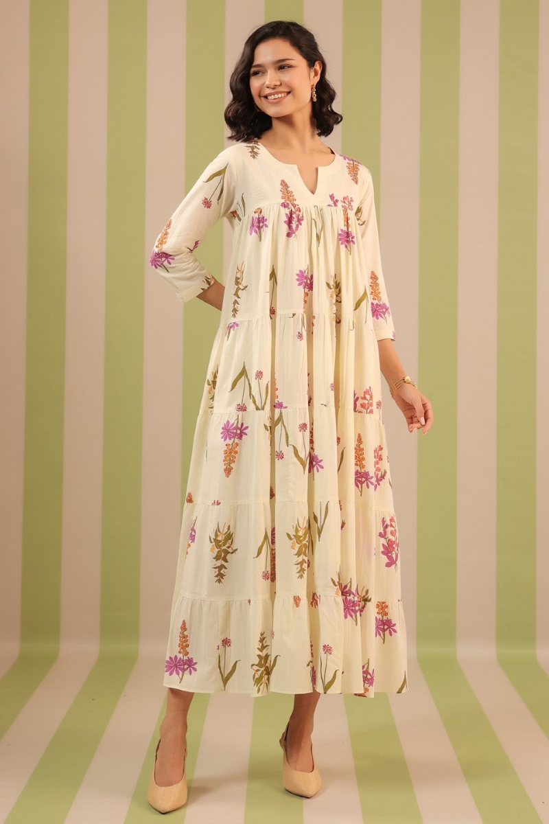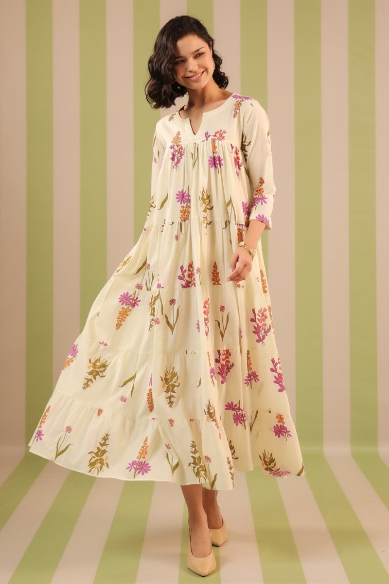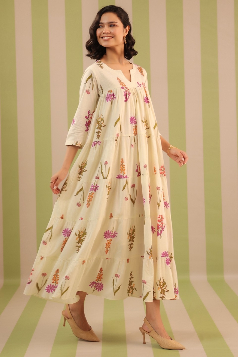 Dress Details: 3/4-length sleeves, ankle-length flared cotton dress with soft lining for comfort. Features a round neckline with a V-cut and vibrant floral print for a fresh, feminine appearance.