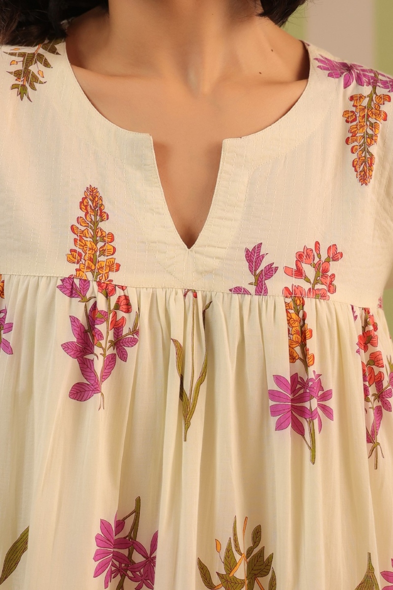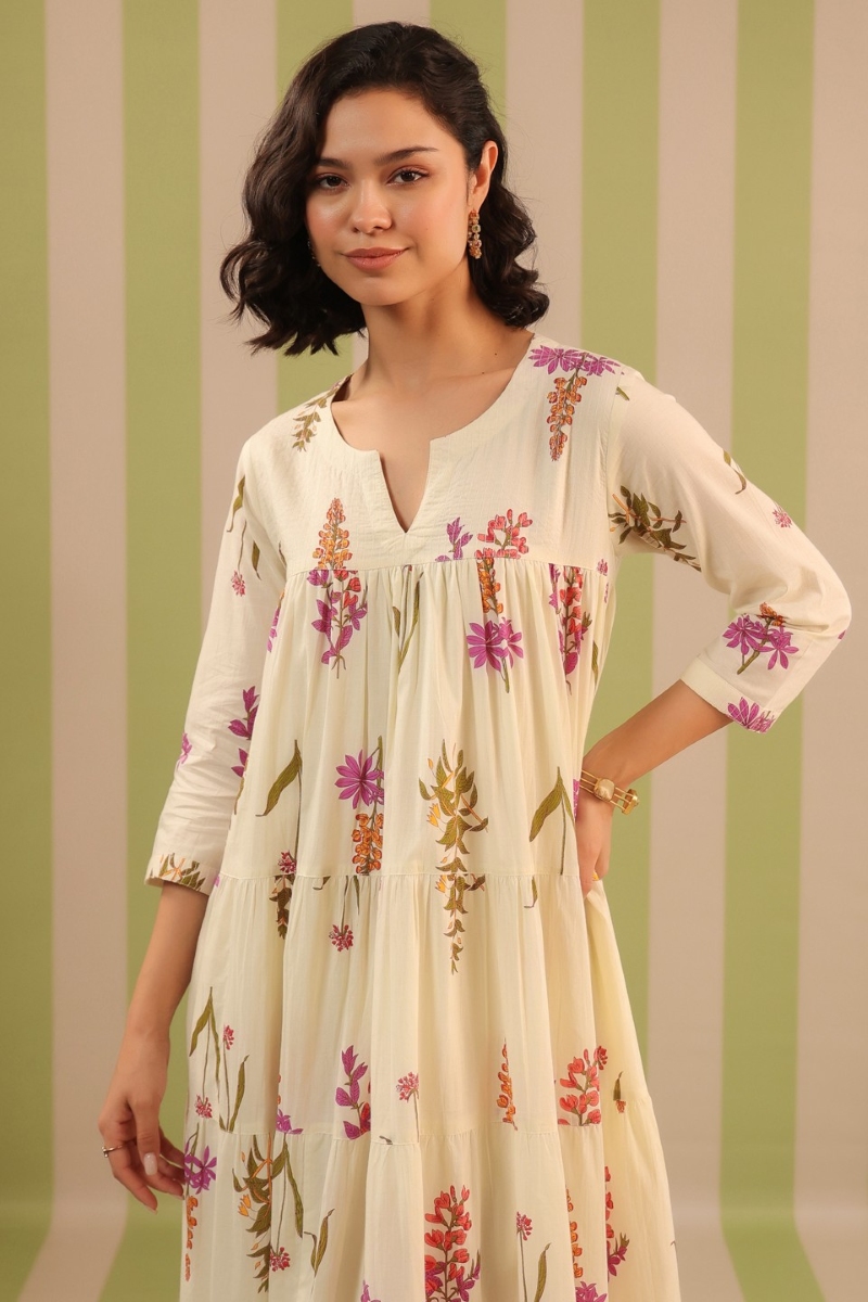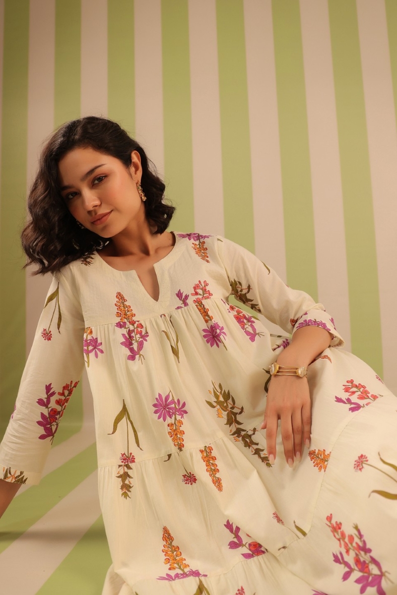 Refresh your everyday style with this elegant White Floral Printed Cotton Flared Dress by Priya’s Panache. Crafted from 100% breathable cotton with a soft inner lining, this ankle-length dress ensures all-day comfort and coverage. The round neckline with a delicate V-cut adds a feminine touch, while the 3/4 sleeves and flowing flared silhouette keep the look modest yet modern.Adorned with bright floral prints, this dress combines the charm of Indian prints with the ease of western styling — making it perfect for brunches, holidays, casual outings, or even relaxed office days. Pair it with flats or ethnic earrings for a breezy Indo-Western look that feels effortlessly chic and comfortable.