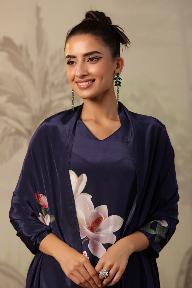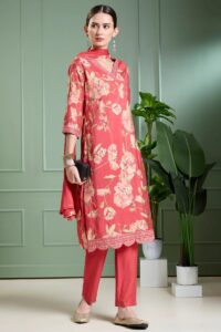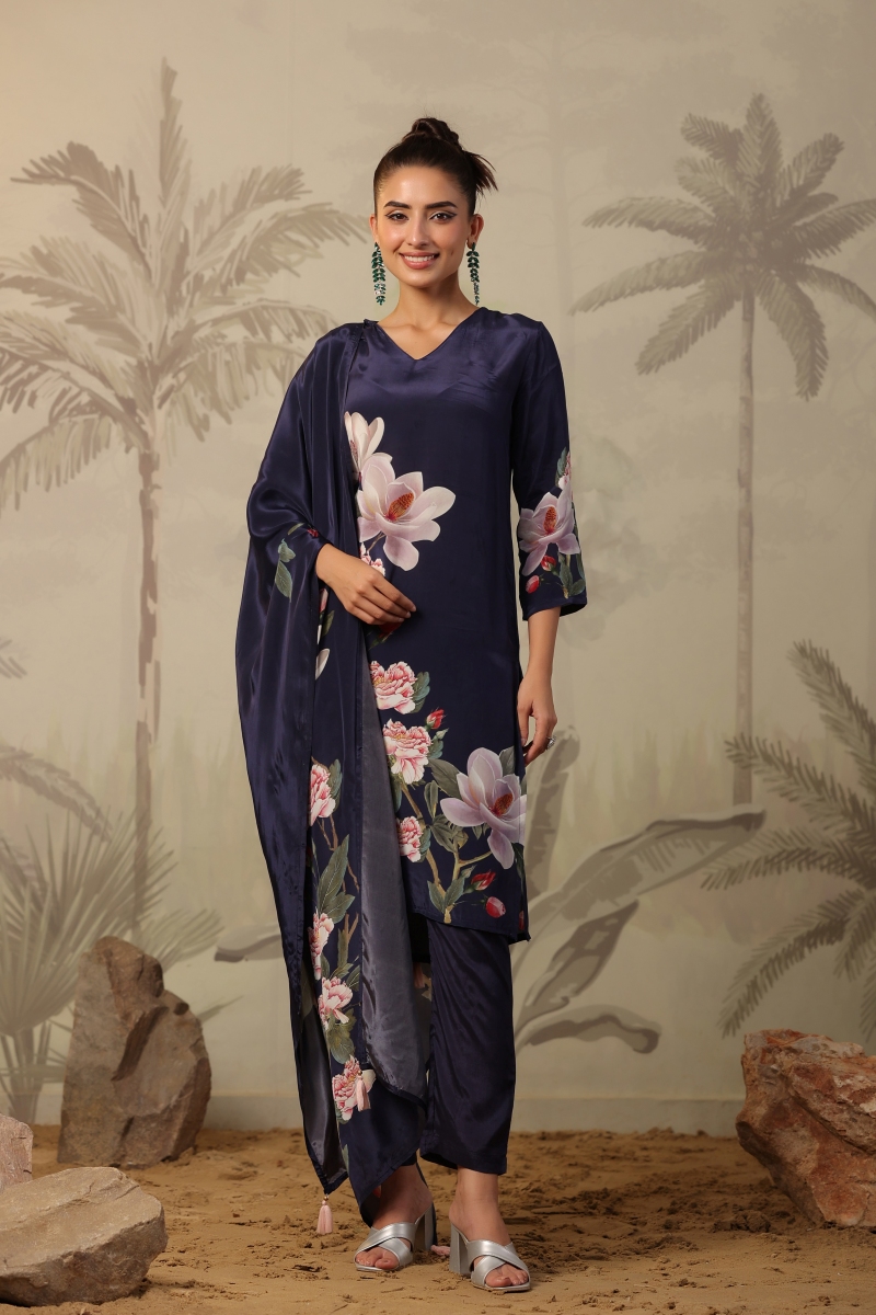 If you are planning to add more solid colours, then consider getting this crepe silk straight suit set. With the shiny texture of silk, the navy blue colour is highlighted better. Suitable for all occasions, this can be the versatile piece you need this year. Fill the dream of sustainable clothing as you style this with different accessories on various occasions.