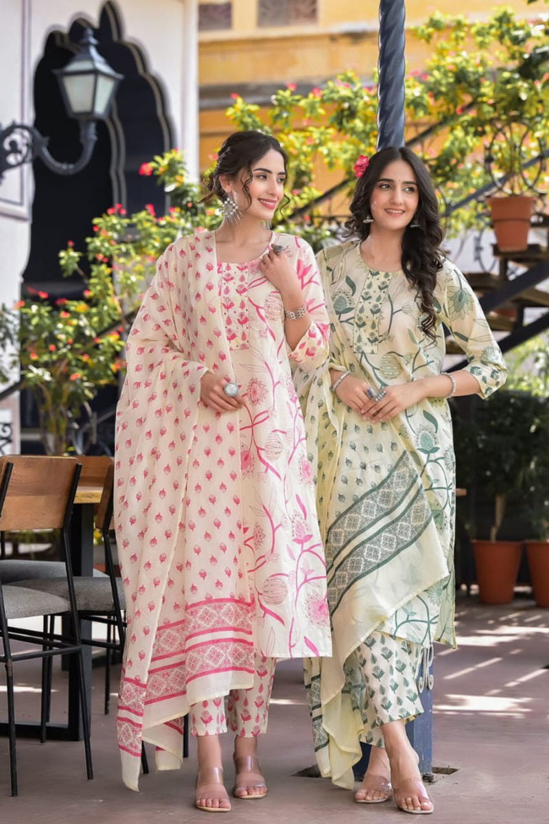 PRIYA’S PANACHE Floral Print Cotton Straight Kurta with Pant & Dupatta Set