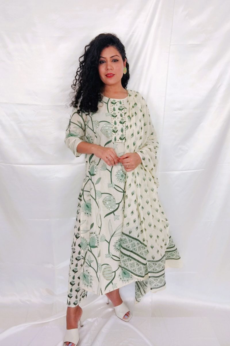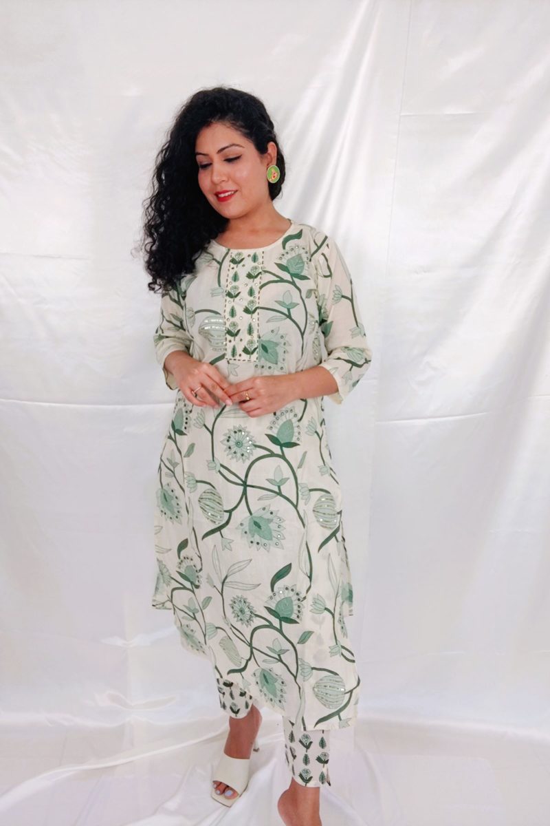 - Kurta: The straight-cut kurta exudes timeless appeal and versatility with 3/4 sleeves lending a touch of sophistication to the kurta, providing a balance between coverage and style. The soothing floral print and color palette make it a delightful choice for any season.