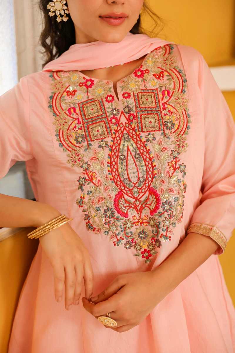 Pink Anarkali Chanderi Embroidered Silk Kurta Set for Women.