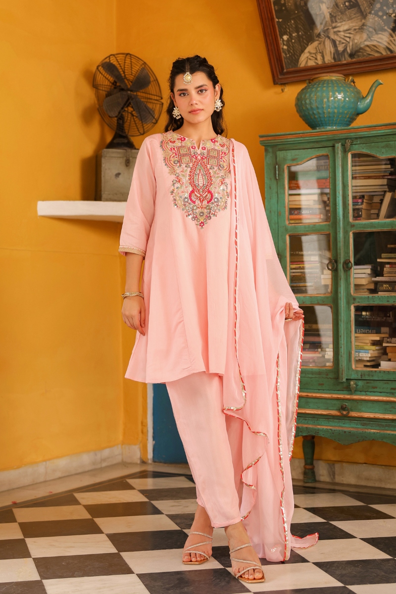 Fabric: Kurta – Chanderi Silk; Kurta Lining – Cotton Voile; Pant – Shantoon; Dupatta – Chiffon