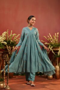 Kurta Details: Anarkali Chanderi silk kurta with intricate embroidery, round neckline, and soft cotton voile lining.