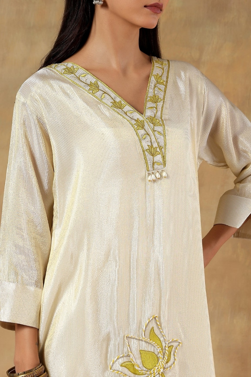 Kurta Details- The textured kurta with a V-neckline screams elegance and comfort. In addition, there are flowers embroidered on it, which earn the brownie points.