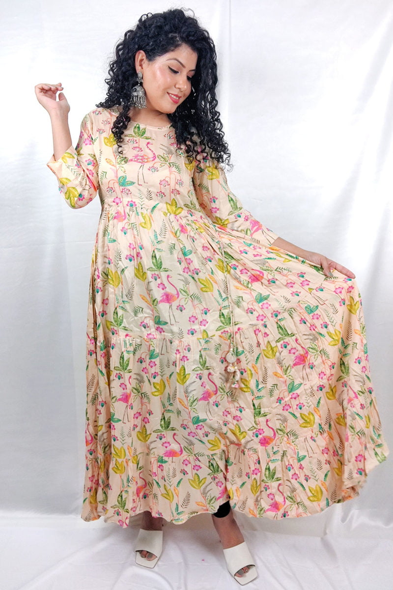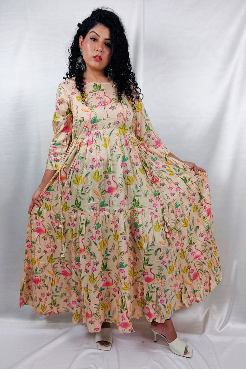 Stylish Vibrant Muslin Printed Flared Gown