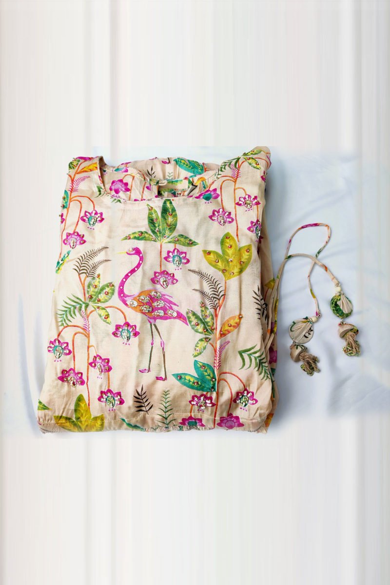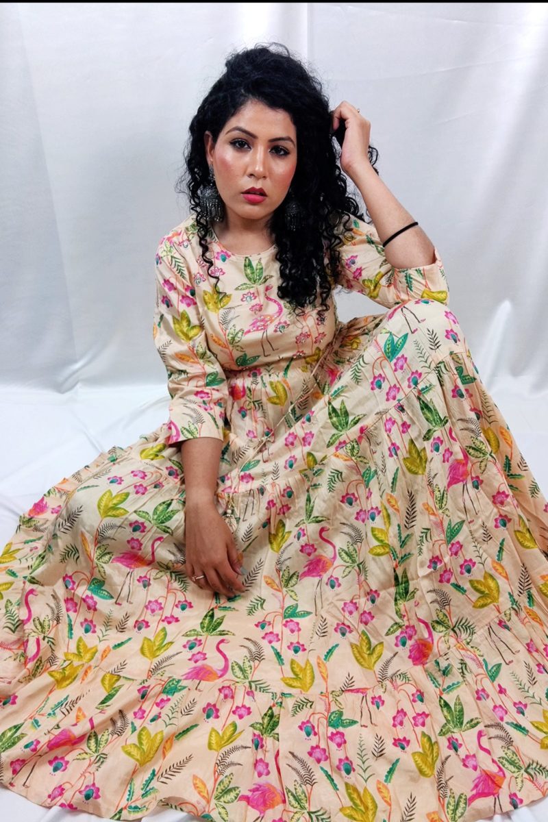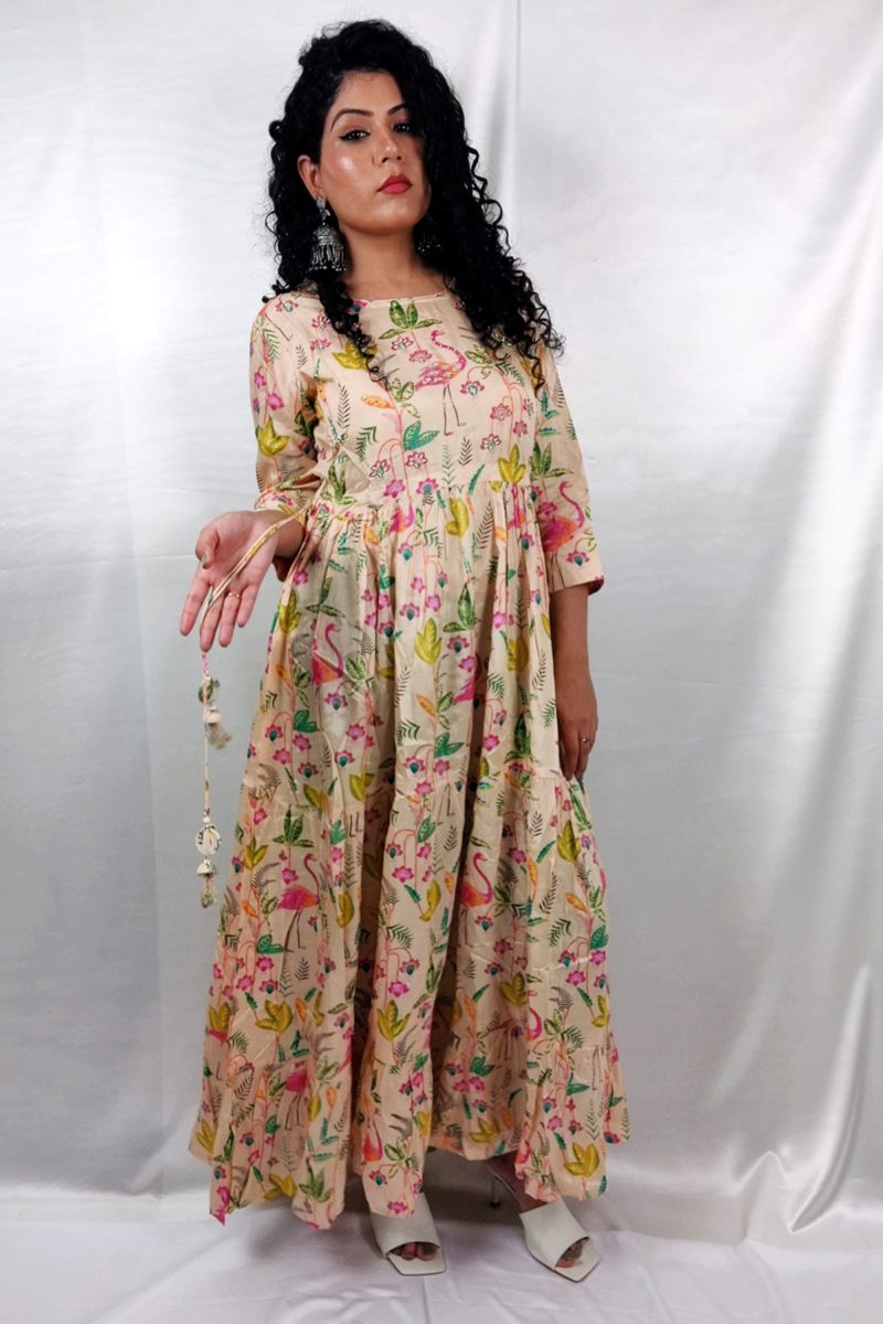 Sold OutIntroducing our stunning and vibrant Maslin fabric Anarkali gown, a true masterpiece of ethnic wear that will leave you mesmerized. This exquisite gown is adorned with a beautiful print that covers every inch, making it a true work of art.