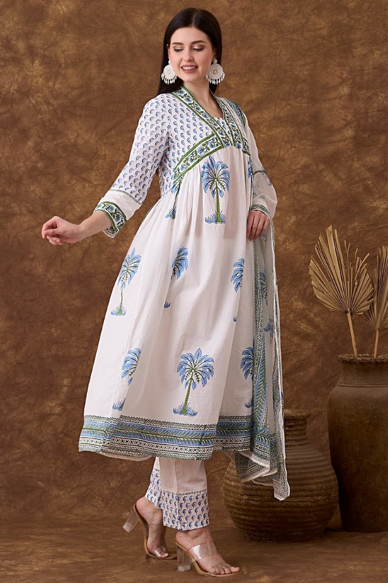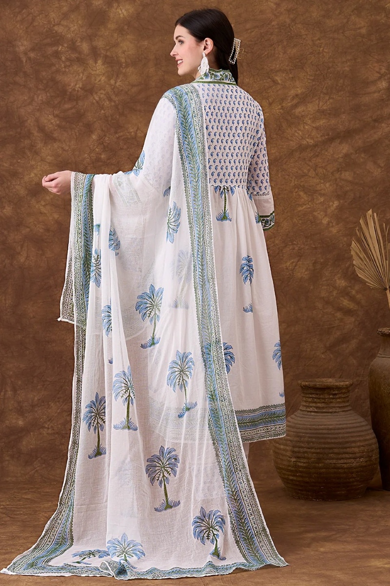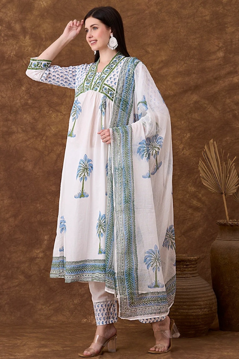 Women’s Ethnic Floral Printed Embroidered A-Line Kurta Set with Pants & Dupatta, made from soft cotton. Perfect for everyday wear, casual outings, and festive occasions. Stylish, comfortable, and complete with matching pants and dupatta.