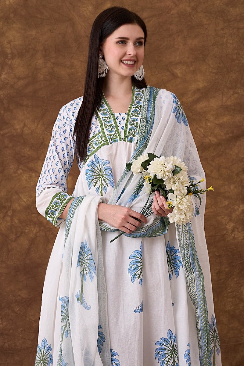 Women’s Ethnic Floral Embroidered A-Line Kurta Set with Pants & Dupatta – White