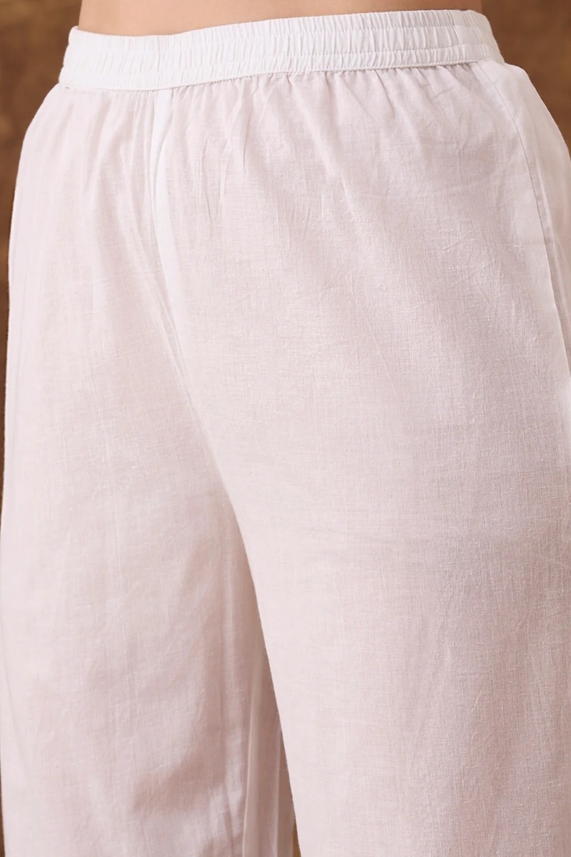 Pants : White colored ankle-length pants with hand-blocked prints all over them. It is made out of cotton blend.