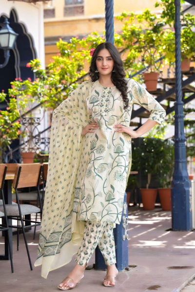 PRIYA’S PANACHE Floral Print Cotton Straight Kurta with Pant & Dupatta Set
